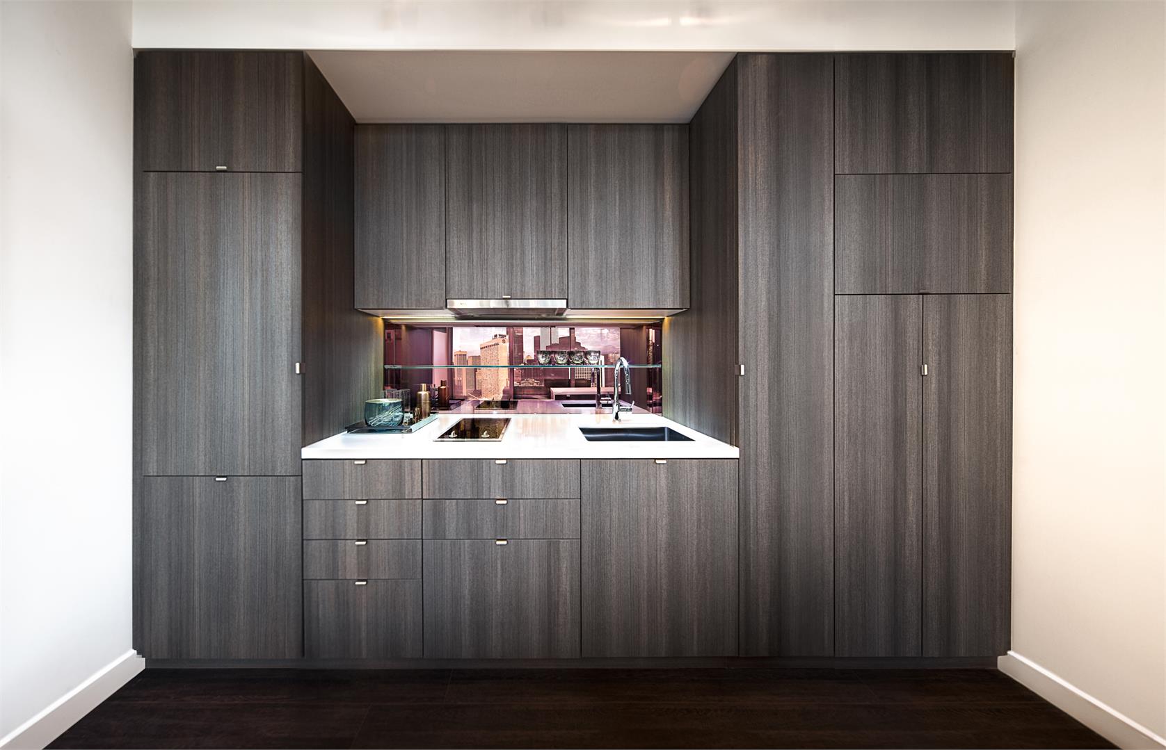How do we make our kitchens sizzle in our smaller suites? Through smart design and a clever choice of space-saving ideas that make the micro-refined go macro-sonic. The smart standouts: an extra-deep counter space with an additional fully-retractable countertop; a slick kitchen island/dining table combo that accommodates all your dining habits; more storage space than usual; and integrated space-saving appliances, including a combination convection oven-microwave, a tall dishwasher drawer, and an integrated fridge. Fitting right in: all the elements that allow you to cook, warm, toast, roast, chill, freeze and do all the clean up.