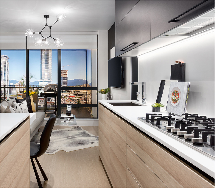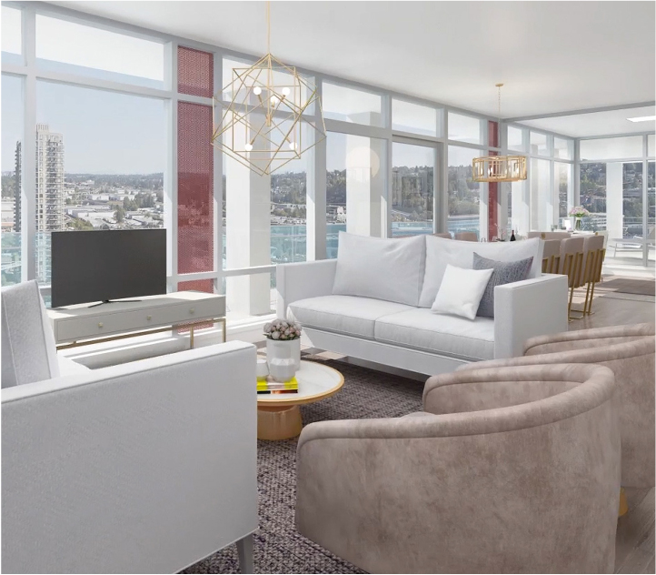 Rising dramatically 23 stories into the sky, Bordeaux is a testament to sophisticated and striking architectural design. With its distinctive combination of concrete and architectural glass elements, Bordeaux sets itself apart from its neighbours. Its unique exterior elements, such as stacked rhythm of columns down the length of the building, angular concrete punch-out sections and fritted glass details, create an artistic and rich exterior aesthetic unique to the Brentwood skyline.