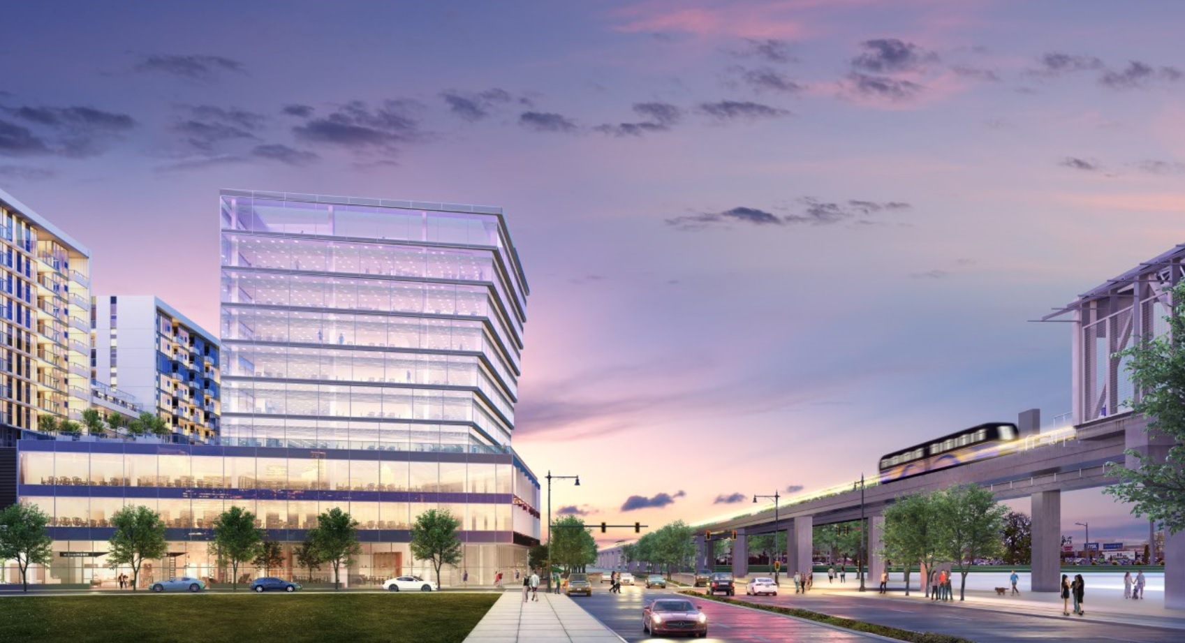 Sleep towers frame a convenience shopping plaza with over 70,000 sq. ft. of retail spaces.