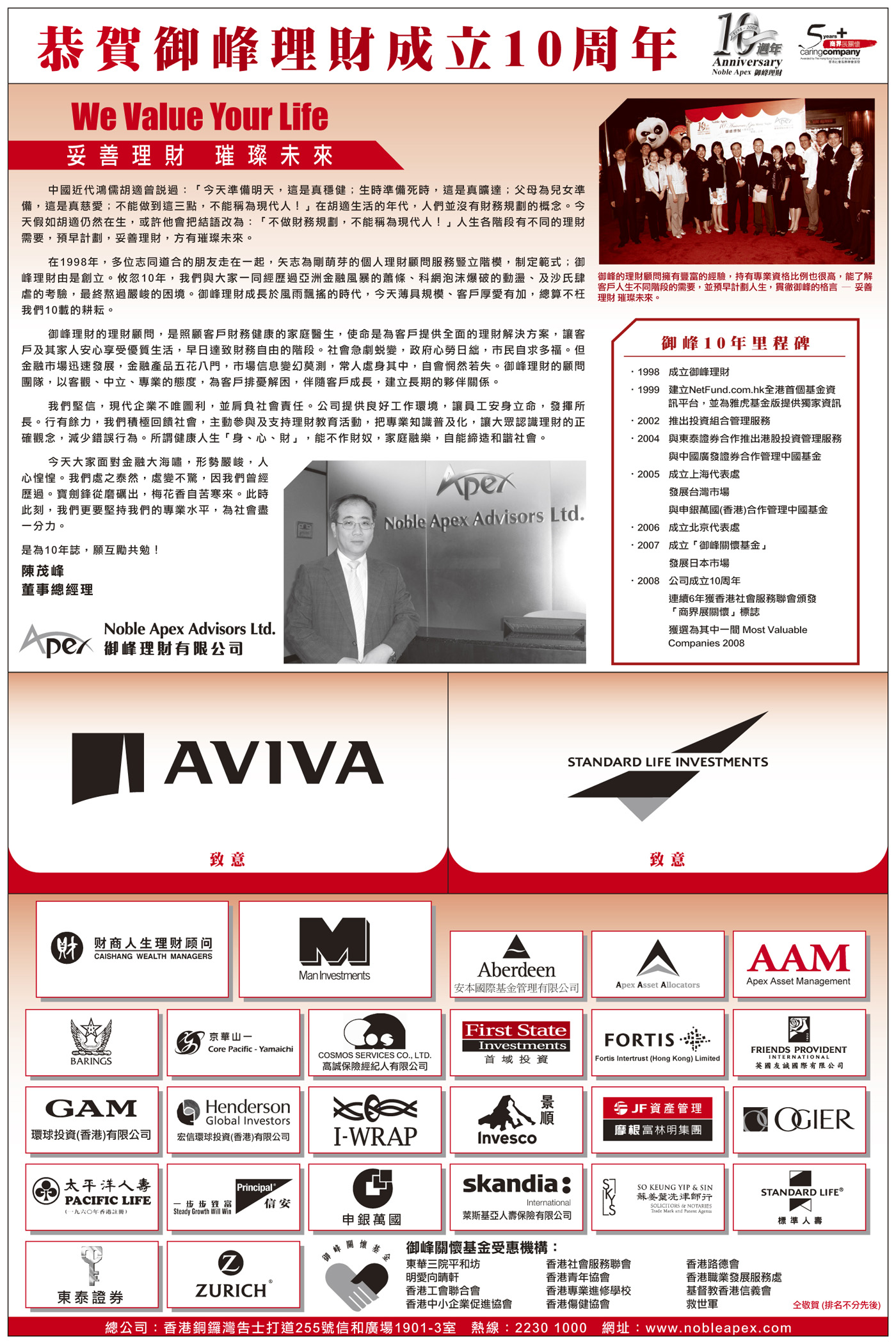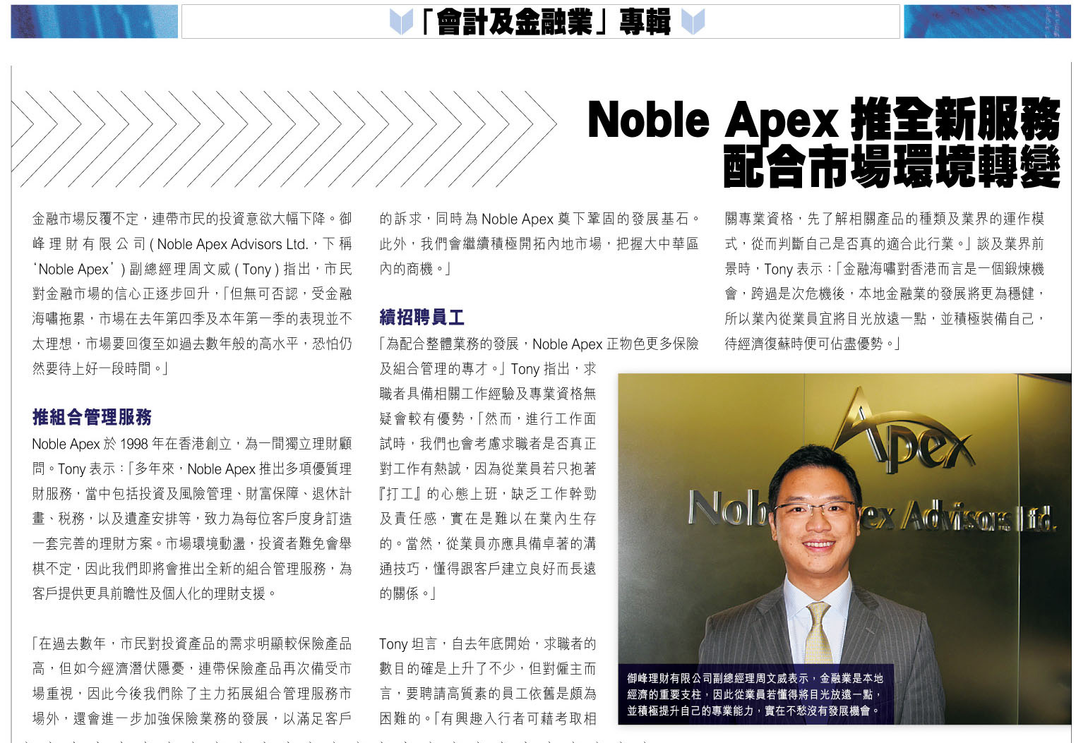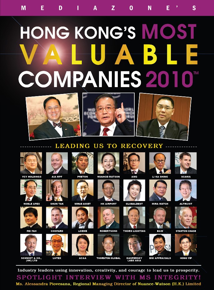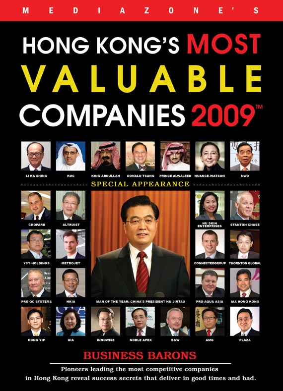 Noble Apex Advisors Ltd. is recently awarded as one of Hong Kong’s Most Valuable Companies 2009 by the Mediazone Group! Our Managing Director, MF Chan, was invited for an interview, with his photo being put on the cover, together with photos of other people such as President Hu Jintao, Chief Executive Donald Tsang, Hong Kong Entrepreneur Li Ka Shing, etc.