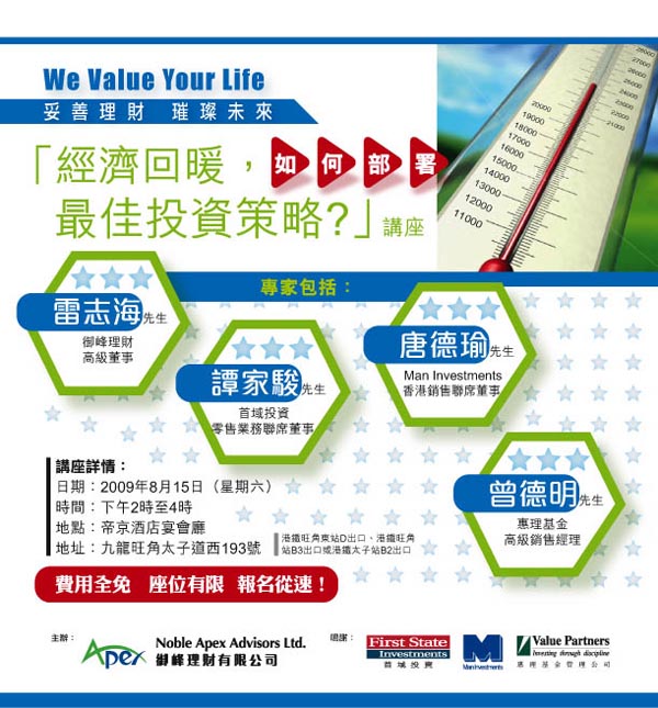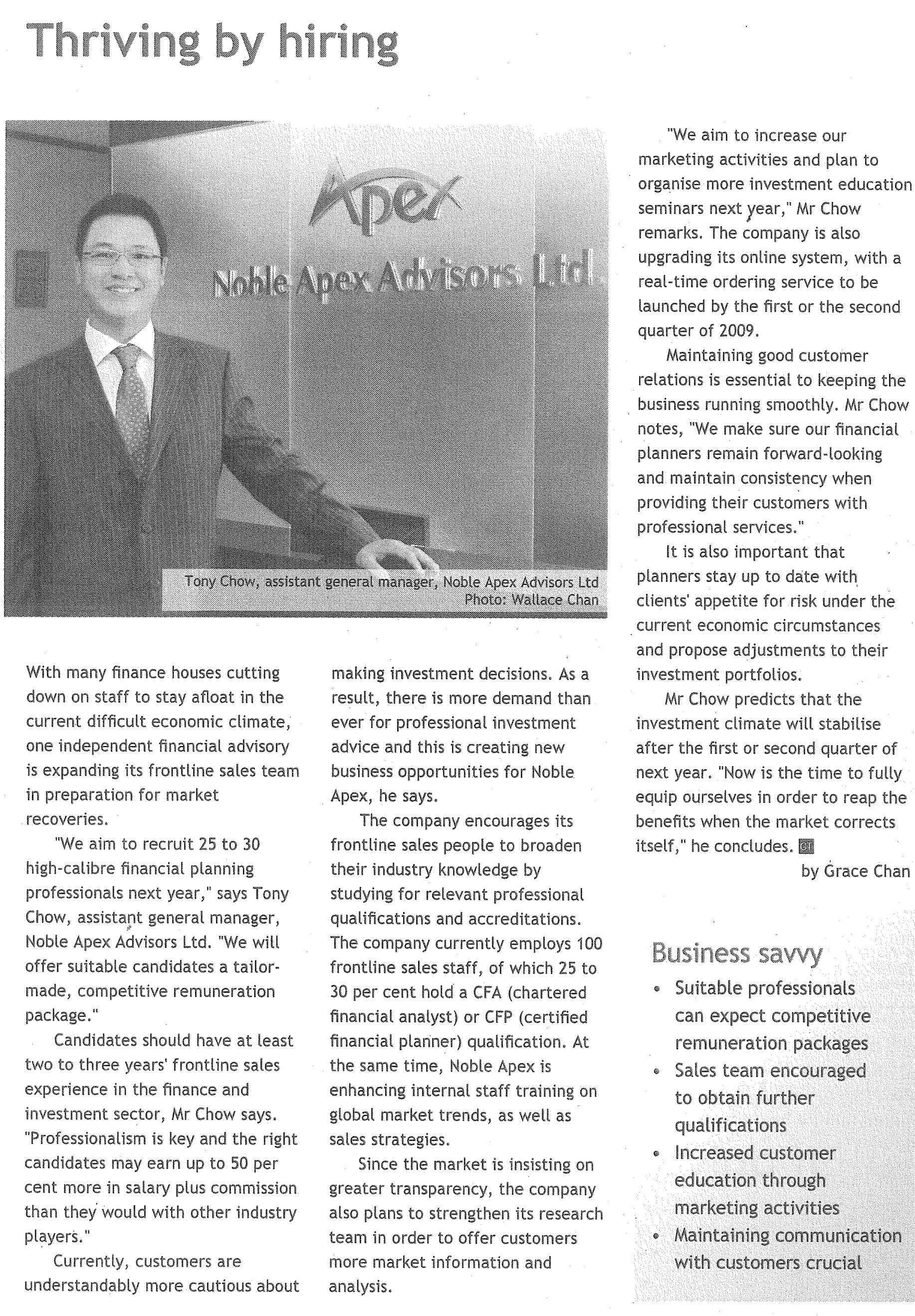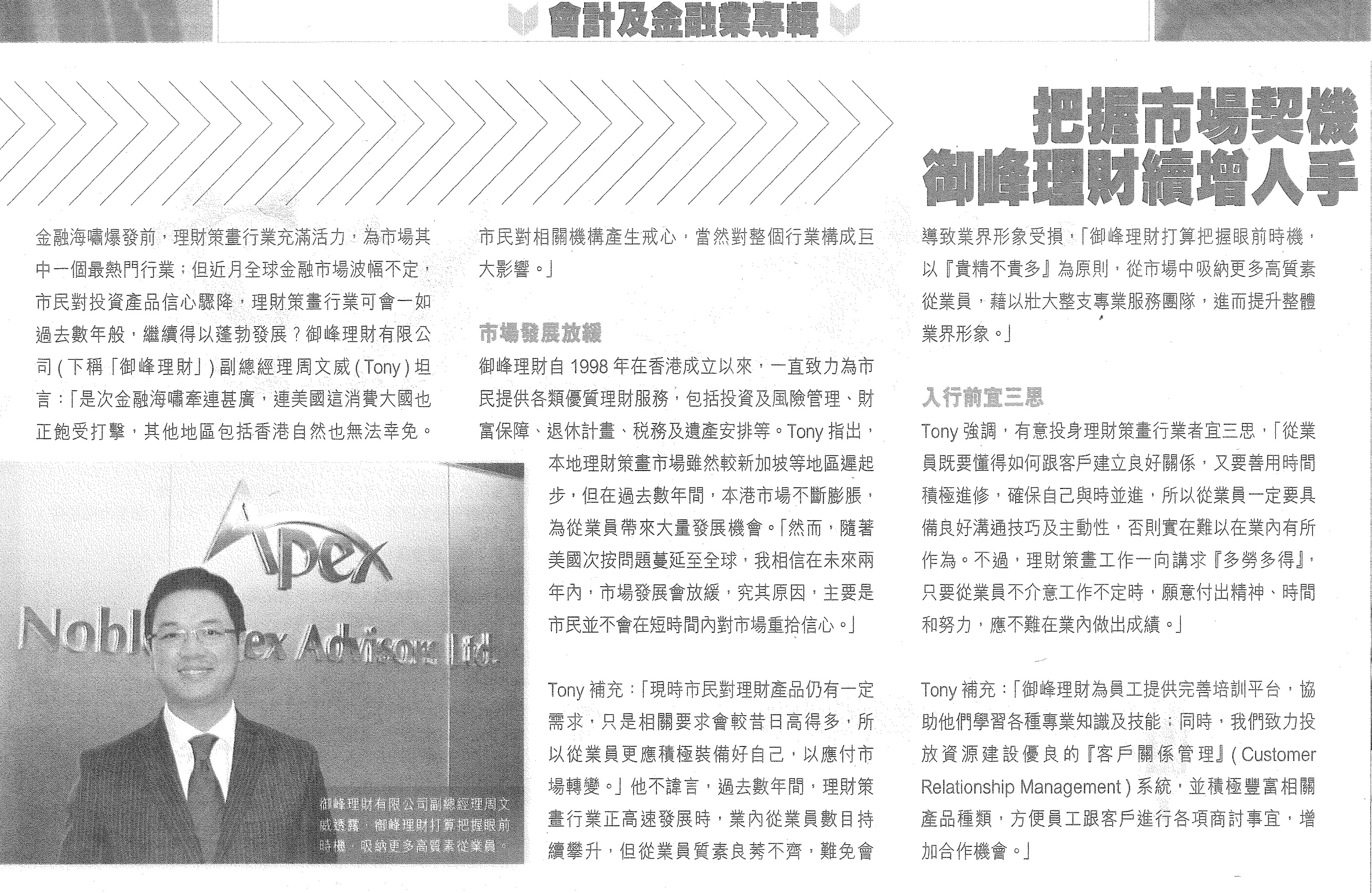 Noble Apex Advisors Ltd. is recently awarded as one of Hong Kong’s Most Valuable Companies 2009 by the Mediazone Group! Our Managing Director, MF Chan, was invited for an interview, with his photo being put on the cover, together with photos of other people such as President Hu Jintao, Chief Executive Donald Tsang, Hong Kong Entrepreneur Li Ka Shing, etc.