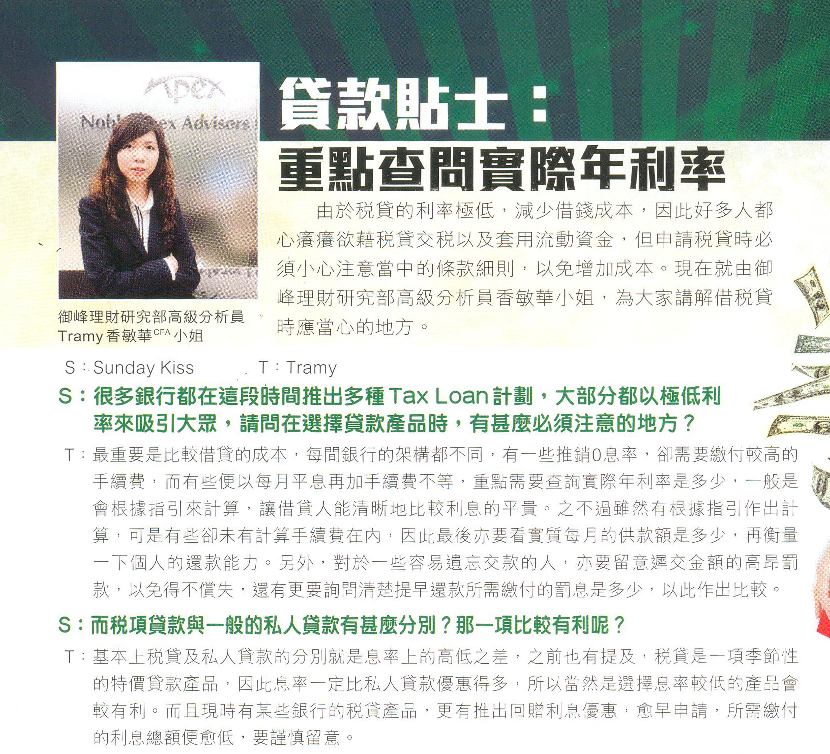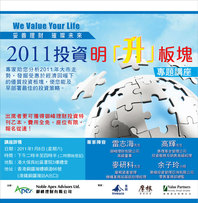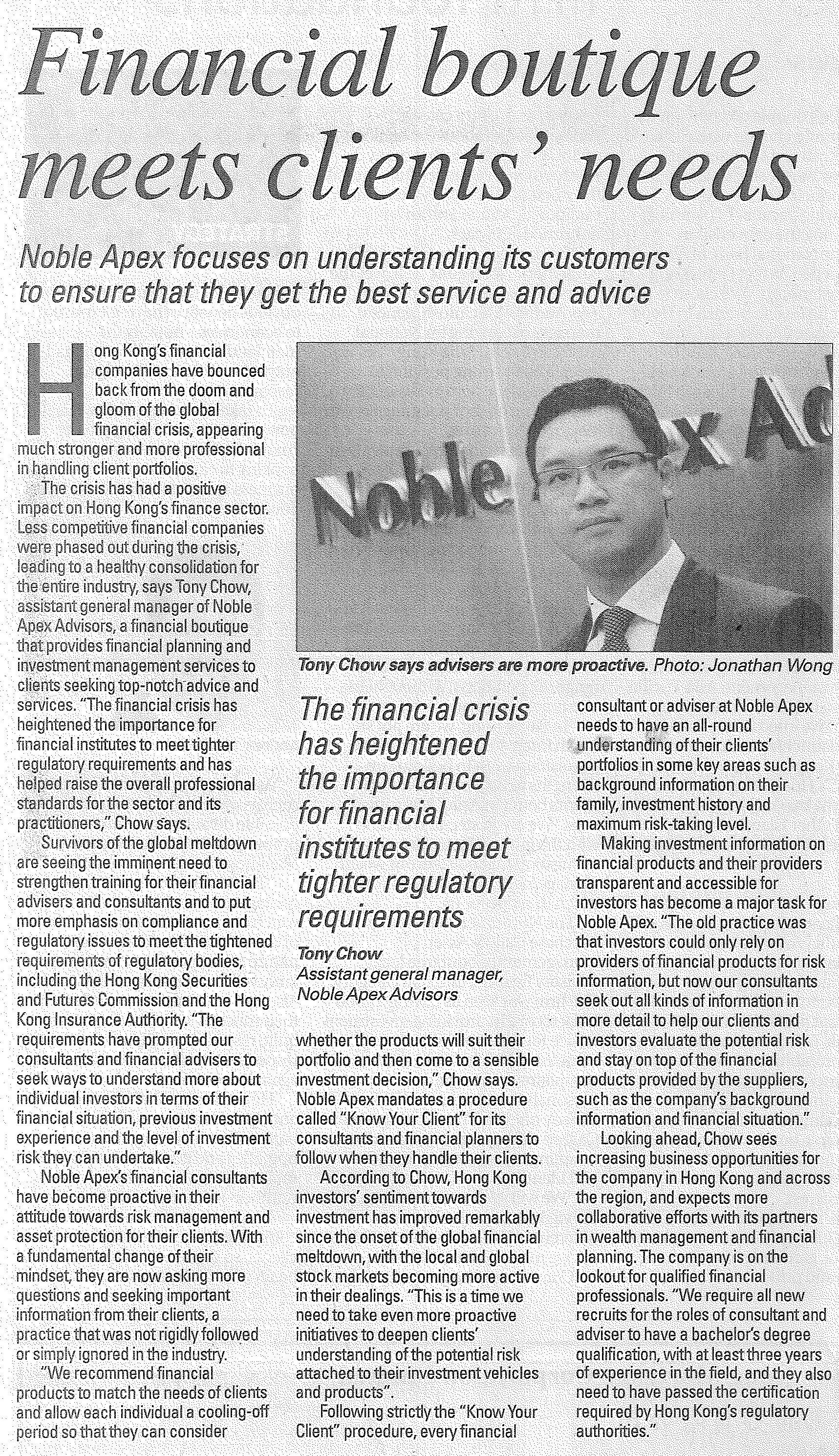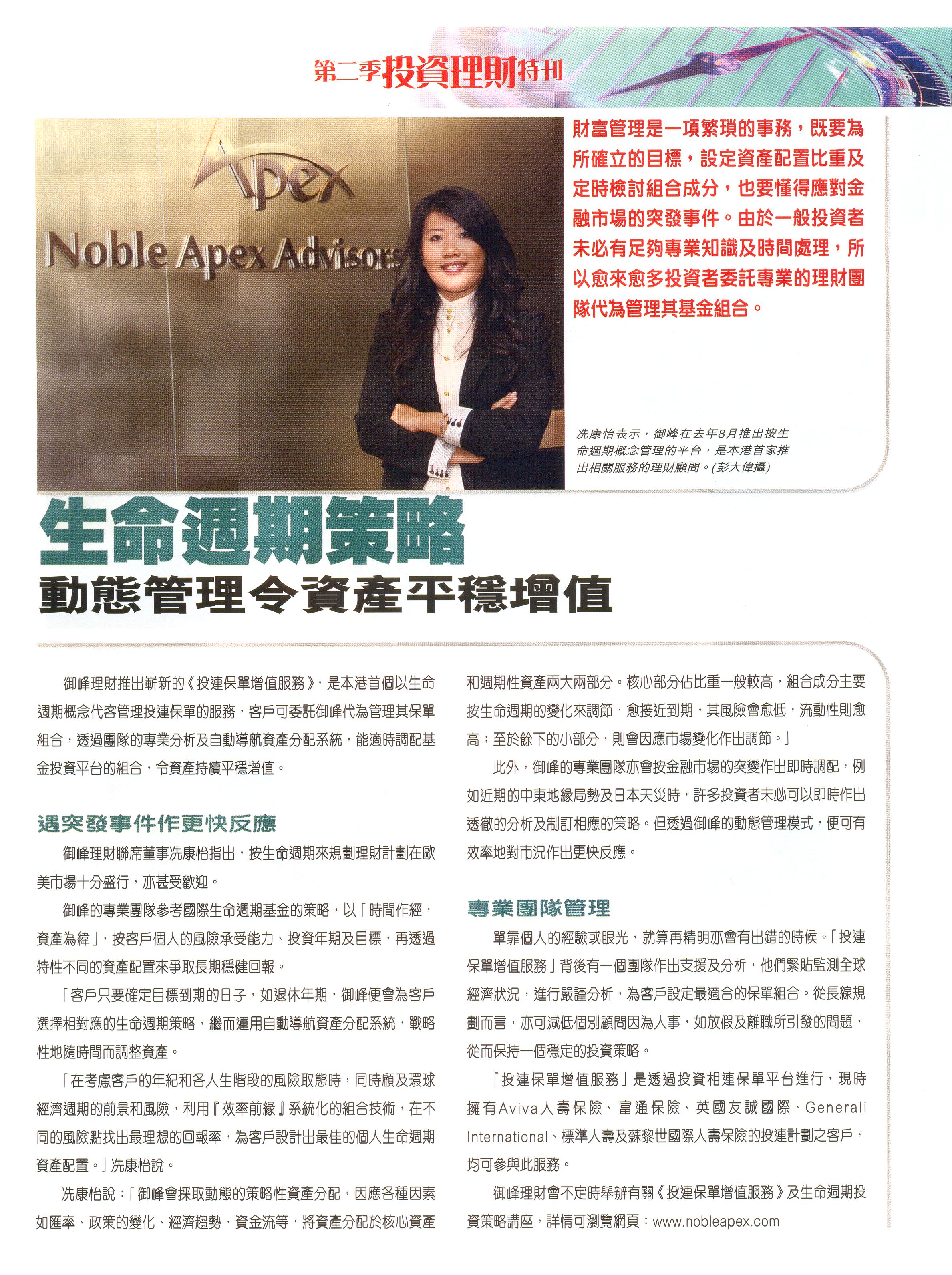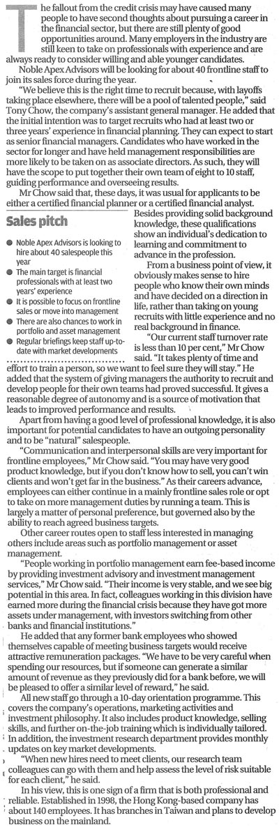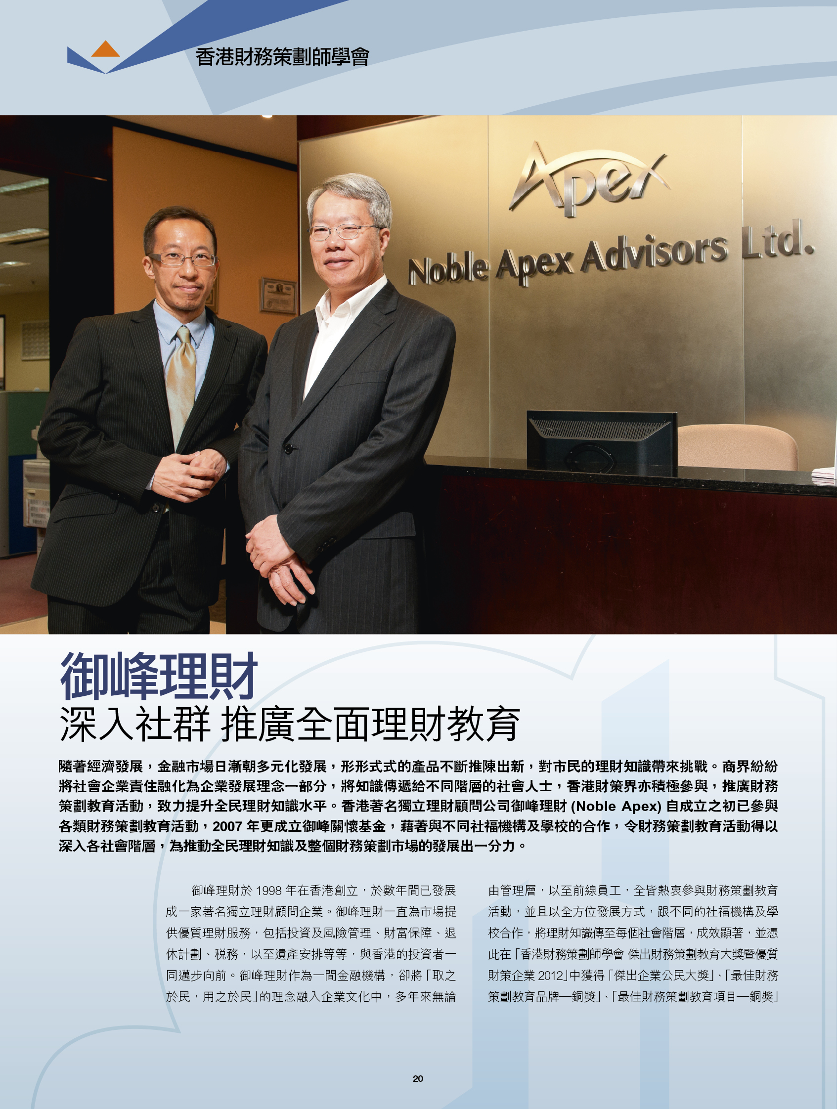 Noble Apex contributes to the community actively, for example, in promoting appropriate financial education in the community and improving public financial management awareness. This year, Noble Apex has been awarded Financial Education Awards 2012 organized by The institute of Financial Planners of Hong Kong ( IFPHK ) and interviewed the concept of our financial education by Capital Magazine.