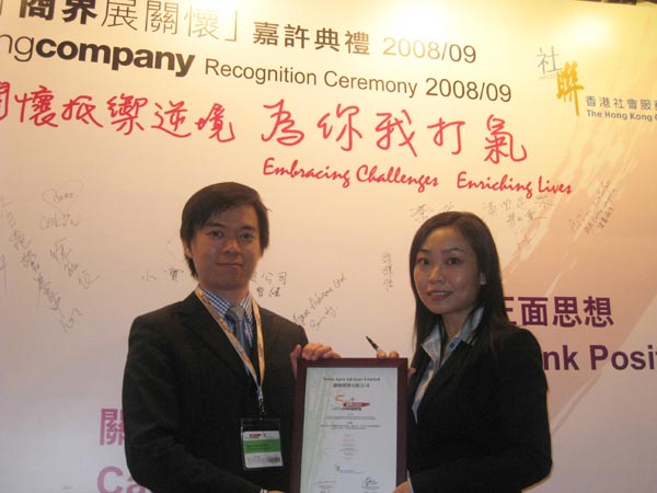 We are pleased to announce our accreditation of the Caring Company Logo by the Hong Kong Council of Social Service (HKCSS) for 7 consecutive years (2002 – 2009). Noble Apex is awarded in 4 areas namely Volunteering, Employment Friendly, Mentoring and Giving. The recognition ceremony took place on 10 February, 2009 with the presence of Mr. John Tsang, JP, Financial Secretary of HKSAR as the officiating guest.