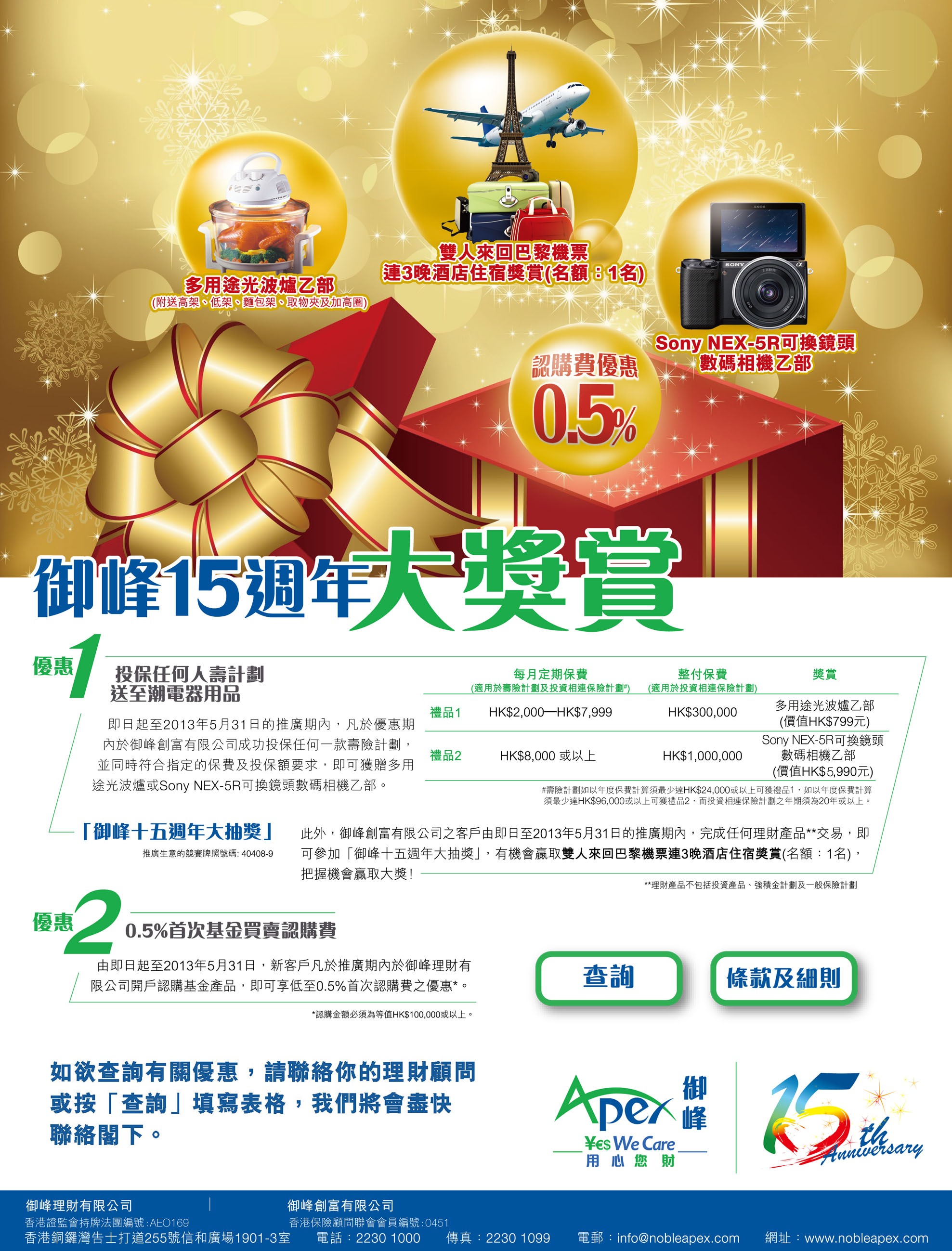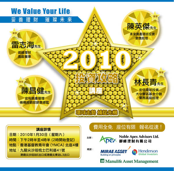 To show our thankfulness towards the valued clients, the Noble Apex 10th Anniversary Reward Program is cordially launched for them. From now until 30th September 2008, customers are entitled to premium rewards upon successful subscription to fund products, saving plans or insurance plans through Noble Apex.