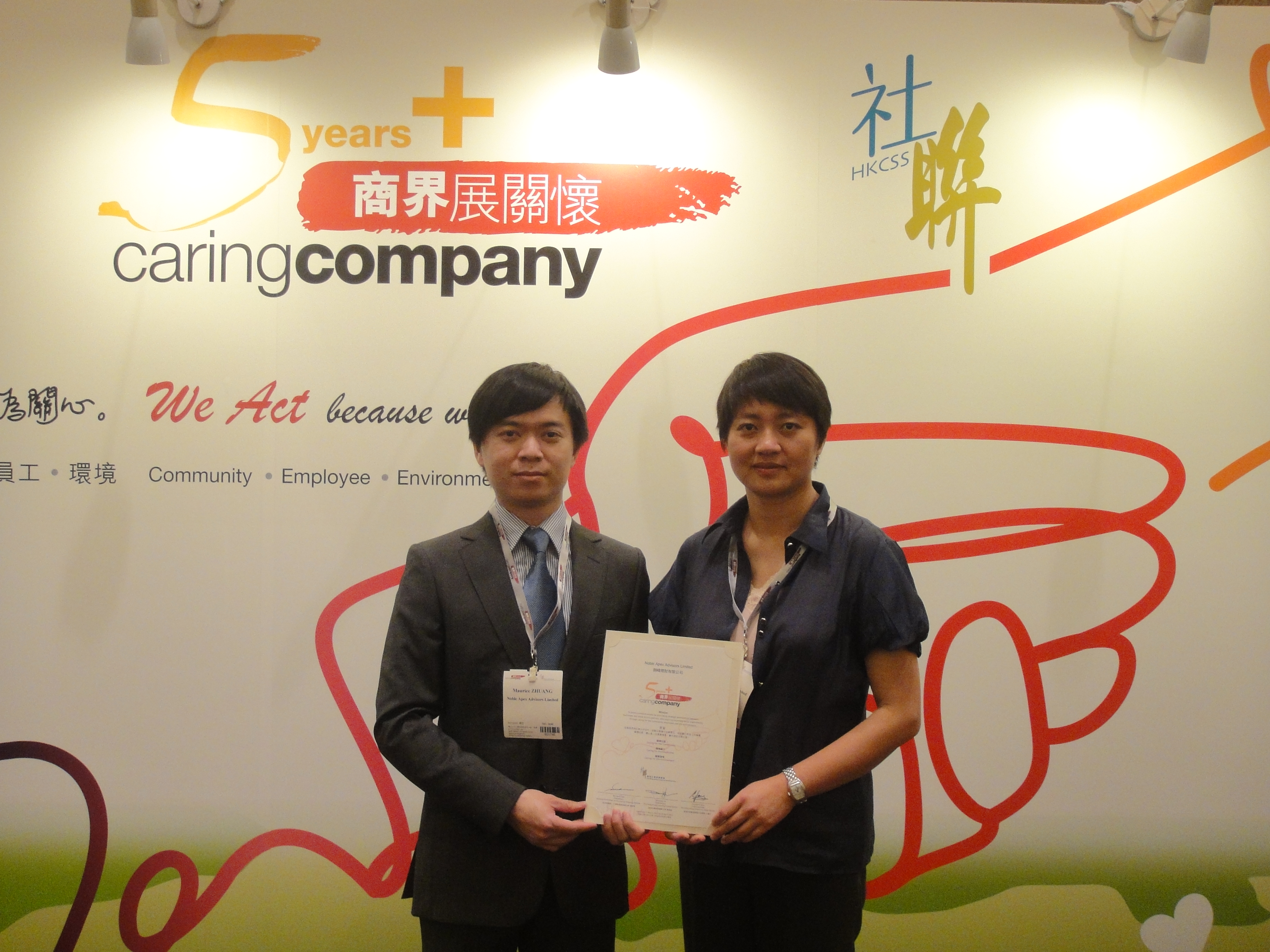 We are pleased to announce Noble Apex Advisors Ltd. was conferred the honor of " 10 Years Plus Caring Company" by The Hong Kong Council of Social Services (HKCSS). The Caring Company Scheme aims at building a cohesive society by promoting strategic partnership among businesses and social service partners and inspiring corporate social responsibility through caring for the community, employees and the environment.