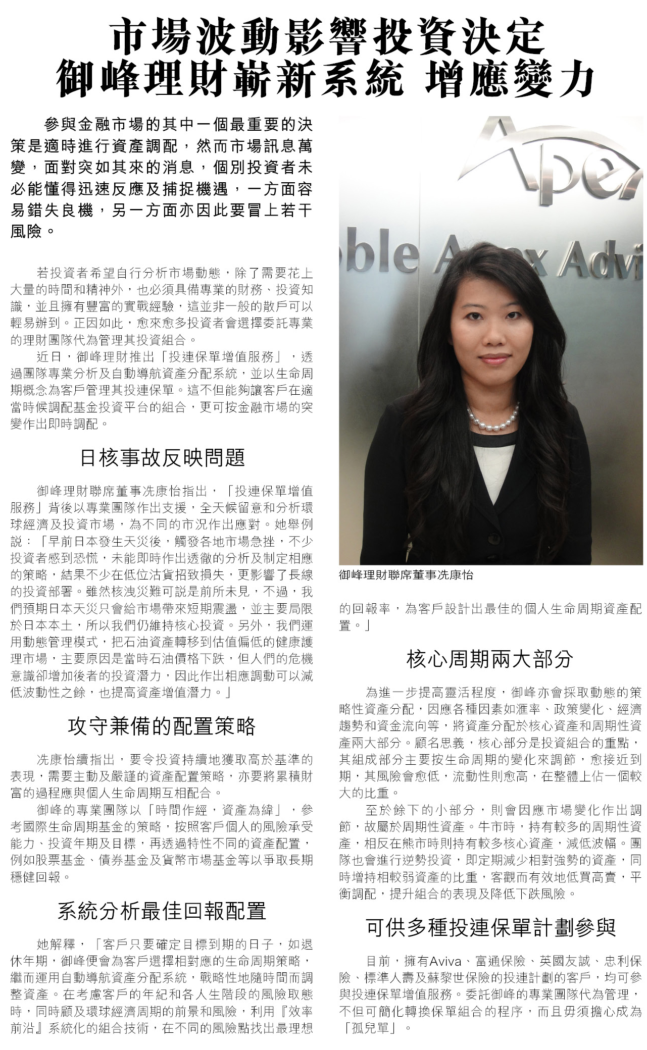 By means of its high flexibility in investment management strategy, Noble Apex provides clients with comprehensive investment portfolios which contribute to optimal rewards for customers even in an ever-changing investment environment, and thus earn the reliance and reputation from our valuable customers. Noble Apex Advisors Ltd. won the Portfolio Management (< 500 Seats) Gold Award in Advisor of the Year Awards 2012 organized by Benchmark magazine. Coupled with dual individual award wins from star financial advisors Stanley Chan Man-Chiu, Chief Sales Director at Noble Apex Wealth and a Category B Gold Award winner in BAYA 2012, and Roy Li, Financial Services Manager at Noble Apex Advisors and a Category B Silver Award winner in BAYA 2012, excellence and professionalism run consistently through the veins of the company.