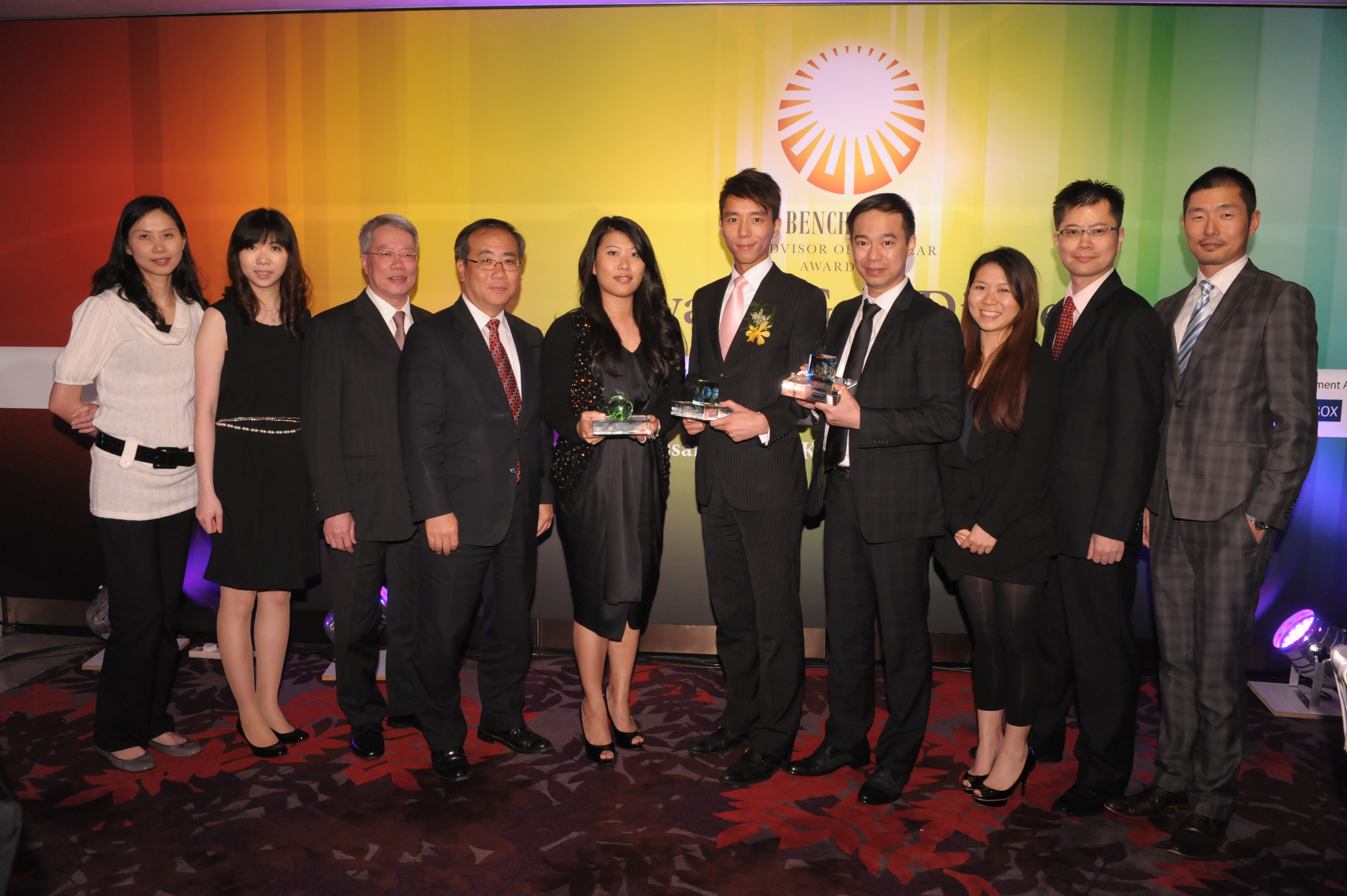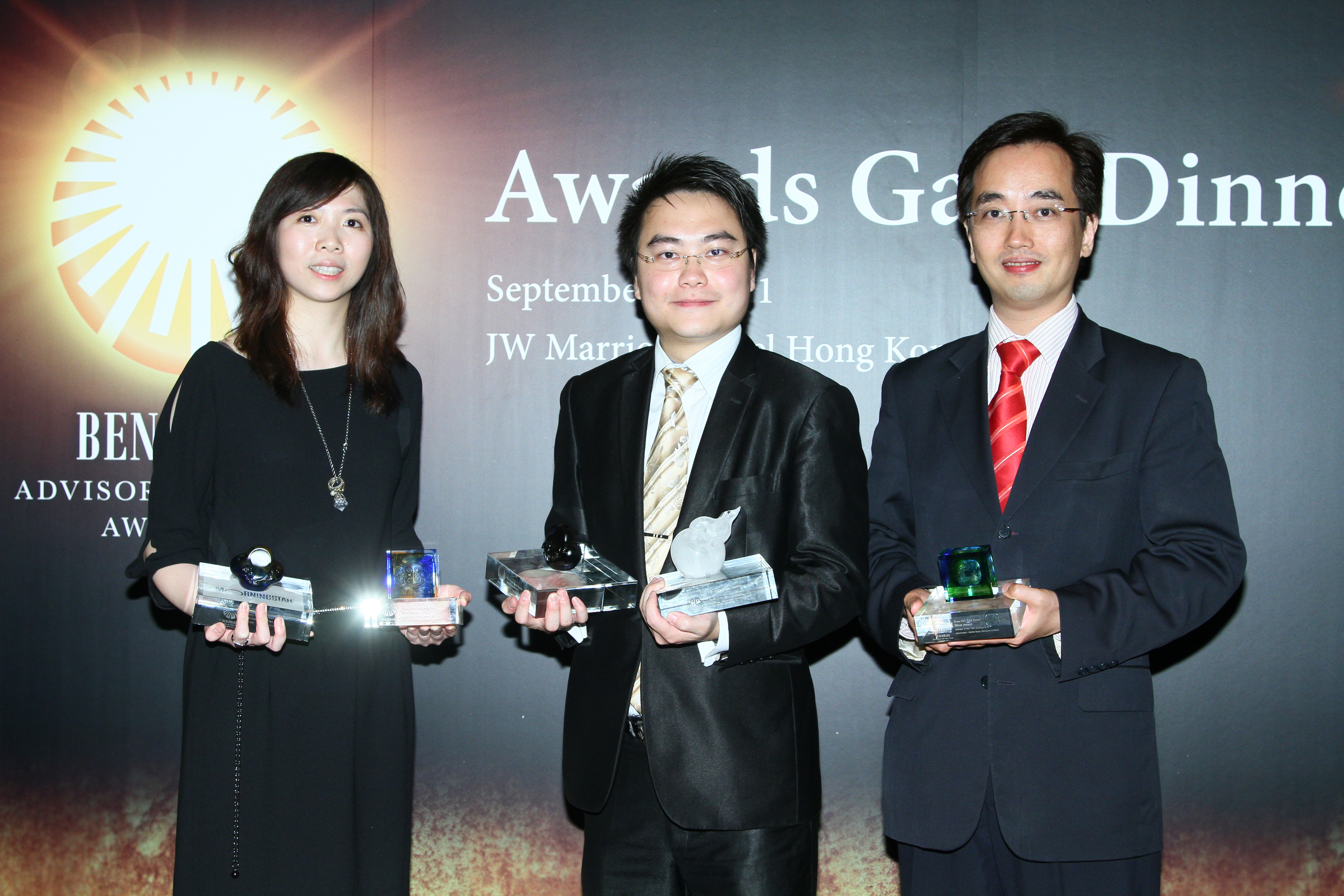 Taking place in JW Marriott Hotel Hong Kong, the awards gala dinner of The Benchmark Advisor Of the Year Awards 2011 has successfully completed at 9 September,2011. Noble Apex Advisors Ltd. has been accredited with five awards, showing its pioneer position amongst its peers. Manton Wai, The Senior Financial Service Manager at Noble Apex, was awarded the Gold Trophy at Benchmark’s Advisor of the years Category B and The Best Financial Plan Award with his outperformance. Tramy Heung, The Senior Analyst of Research and Asset Management at Noble Apex, was the winner of Silver Trophy for Category B and The Best Investment Plan Award. While Ivan Ng, The Associate Director at Noble Apex was also the winner of Silver Trophy for Category B, proving the impressive strength of our professionals.