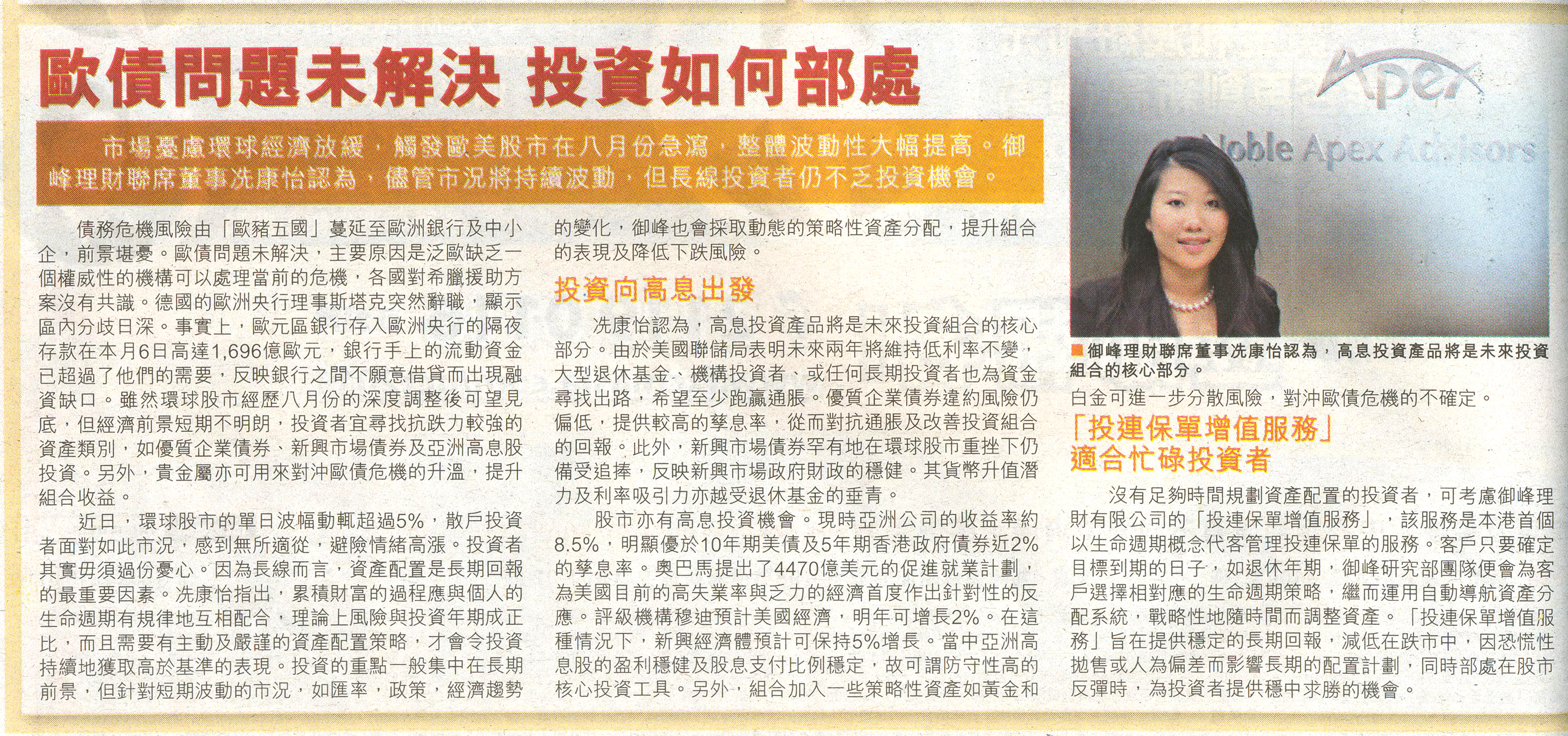 This issue, titled “No double-dip recession but Europe a worry”, discusses the possibility on double-dip recession in US and the latest asset allocation strategy . Don't miss this valuable reading experience!