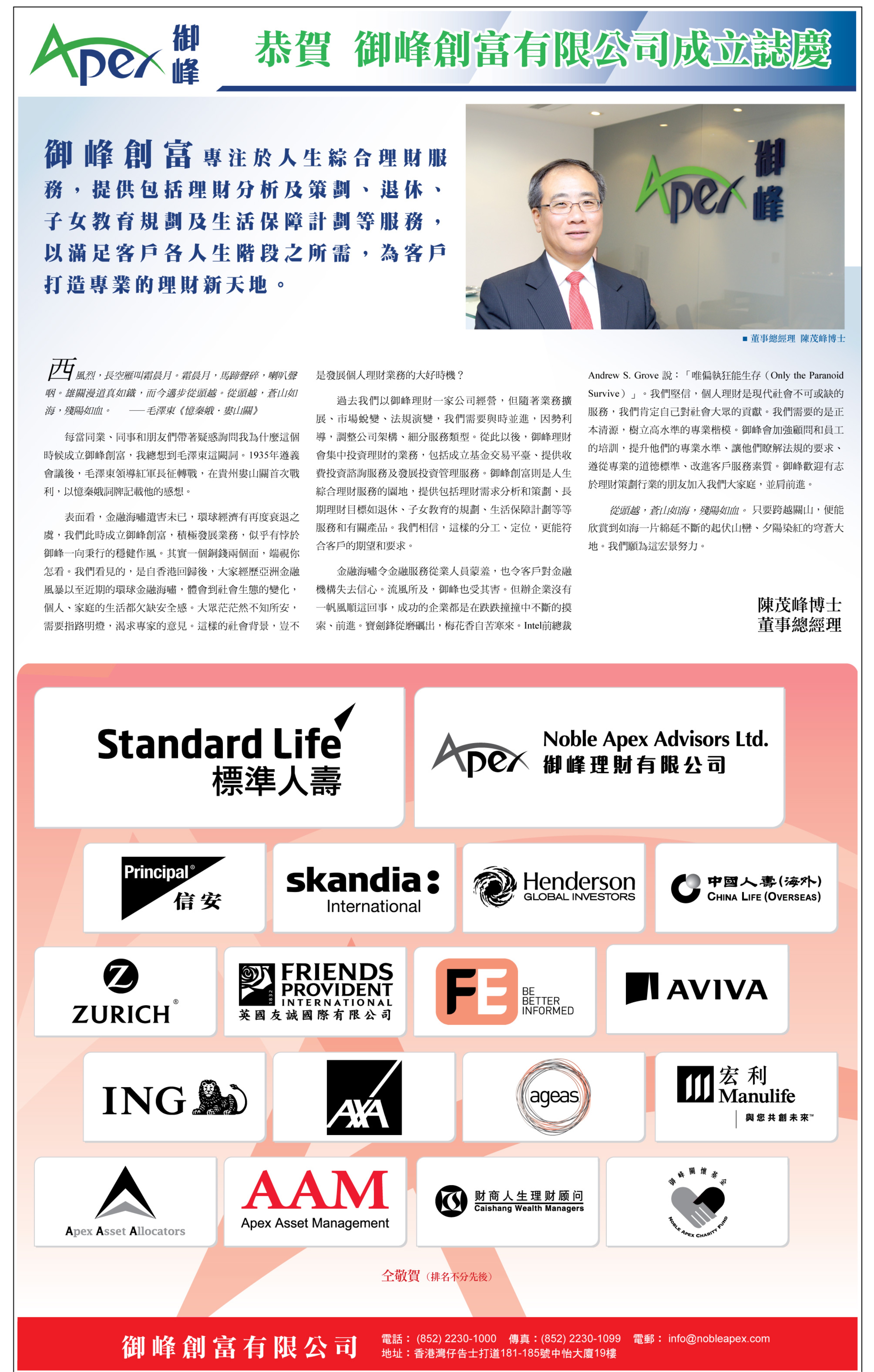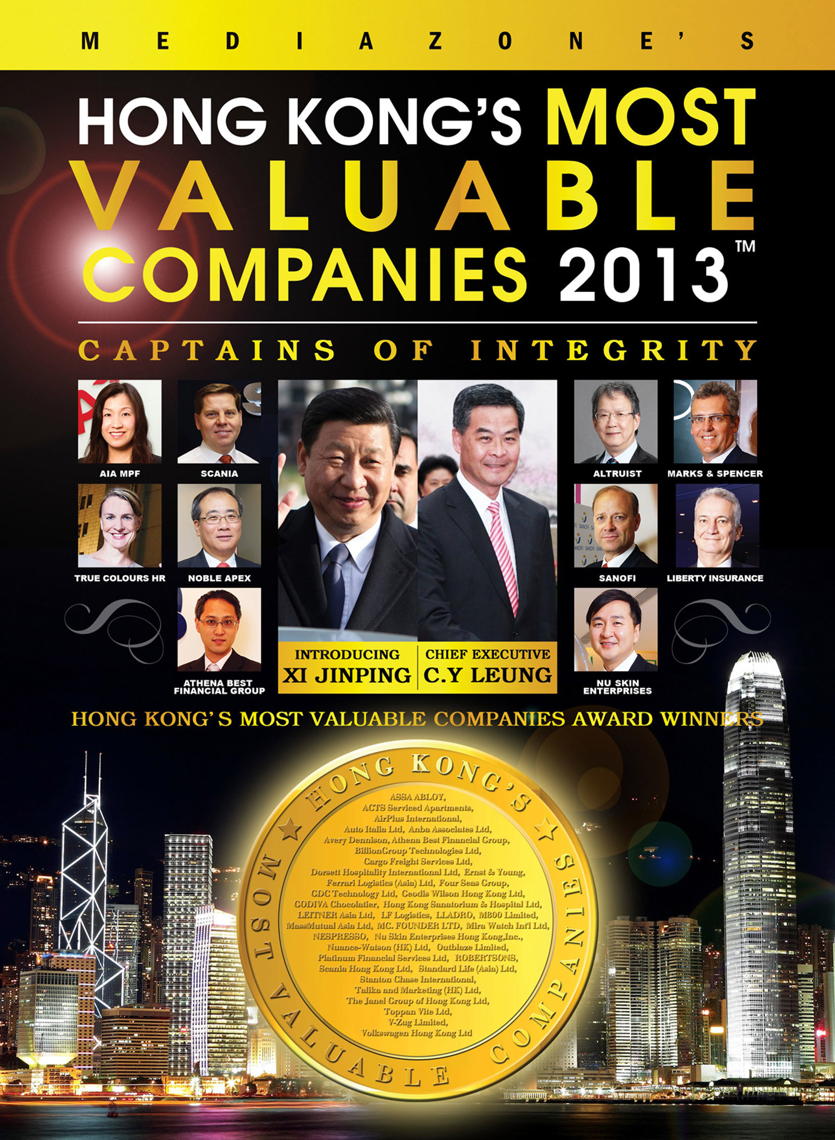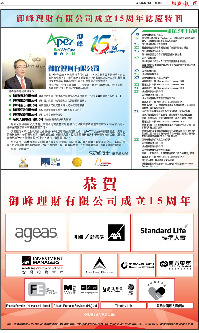 Noble Apex Advisors Ltd. is just awarded one of Hong Kong's Most Valuable Companies 2013 in January this year. The company is proud and excited to get this award from the Mediazone Group for the sixth consecutive years. Our Managing Director, Dr MF Chan, is invited as one of the figures on the magazine cover together with President of the People's Republic of China Xi JinPing, Chief Executive of Hong Kong C.Y Leung, etc.